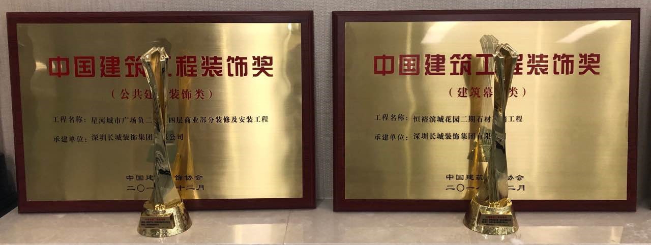 2019-4-4中国建筑装饰行业最高奖项“中国建筑工程装饰奖”评选结果揭晓,我司申报的“星河城市广场负二层至四层商业部分装修及安装工程”、“恒裕滨城花园二期石材幕墙工程”、“万和科技大厦幕墙工程”、“信达君悦天下酒店装饰装修工程”获得“2017-2018年度中国建筑工程装饰奖”。