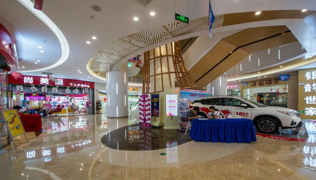 获奖项目“星河城市广场负二层至四层商业部分装修及安装工程”位于广东省东莞市,充分利用建筑的空间结构,延长商品展示与品牌形象展示的线与面,空间疏、密、高、低及其展示层要符合人体工学的视觉效果,利用不同材质和造型的天花结构具有流线型,具富美感。中庭柱身钢结构构造新颖,极富艺术欣赏性。柱身、墙身铝板与透光板圆点排列弧线增加流动感。地面地砖套割精确,接缝严密,整体美观。新型材料GRC波浪板应用,材质轻,安全性能好,丰富了天花造型。铝质转印木面天花弧形线条造型排列均匀,具有韵律感。铝质转印木面板安装平整度好,拼缝严密,结构安全。地面采用不同颜色的六角地砖,与天花造型相互响应,营造出童话般的儿童世界。