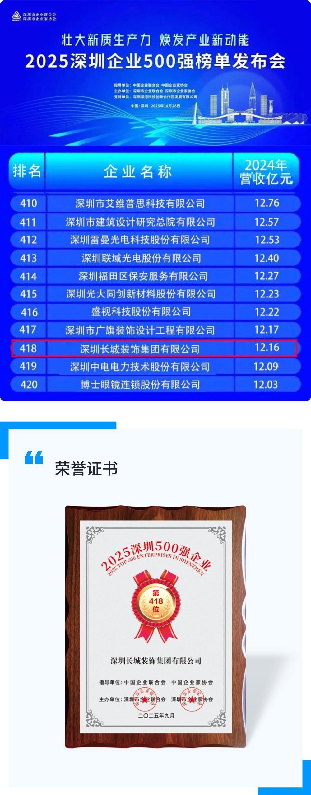 近日,深圳长城装饰集团有限公司凭借卓越的综合实力与行业贡献,成功入选2025年度“深圳企业500强”榜单。这一荣誉不仅彰显了企业在装饰行业的领先地位,也体现了其稳健的发展态势与持续创新的核心竞争力。