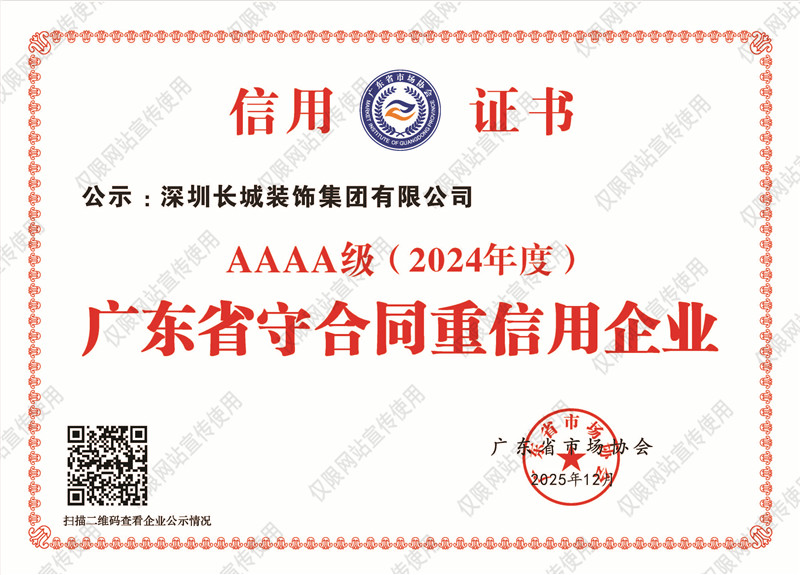 广东省“守合同重信用企业”评定以严苛著称,从合同管理、履约能力、社会信誉、经济效益等多维度综合评审。AAAA级作为现行最高等级,要求企业具备显著的行业影响力和持续合规记录。深圳长城装饰集团同步荣膺深圳企业500强、中国建筑装饰百强企业,印证其综合实力与信用价值的双重领先。