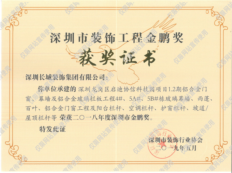 该获奖项目分别是“深圳市中航健康时尚集团股份有限公司英龙优莱荟装修工程”和“深圳龙岗区启迪协信科技园项目1.2期铝合金门窗、幕墙及铝合金玻璃栏板工程”。获得的奖项分别是“2018年度深圳市装饰工程‘金鹏奖’中的‘公装类工程奖’和‘幕墙类工程奖’”。