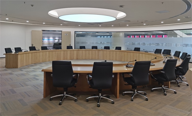 办公区分为大堂接待区、产品展示区、会议区、办公区域VIP接待区等,动线分明,空间布局合理。接待区及展示区采用轻钢龙骨石膏板、亚克力及透光膜流线型天花,地面采用天然石材、进口自流平及地毯弧线分割方式有机结合。墙面采用浅色木饰面和白色涂料弧面造型,独特标志性白色造型树寓意着成长和发展,不同造型的展台及多媒体展示主要产品。会议室采用弧面玻璃间隔,灯光照明采用隐藏式设计,光线柔和舒适。整体色调风格明快、简洁、大方、协调、现代、统一,体现出科技感和绿色环保的主题。