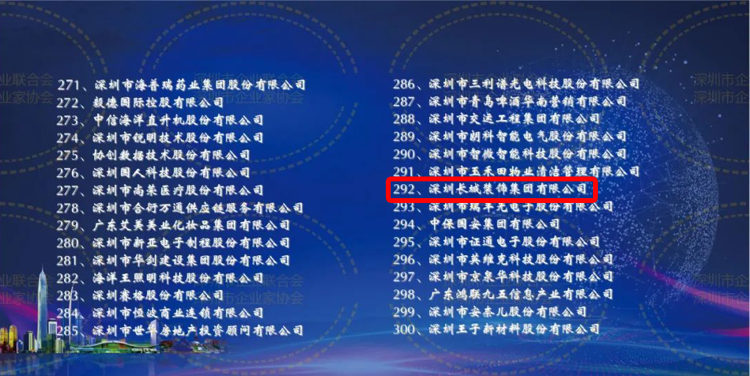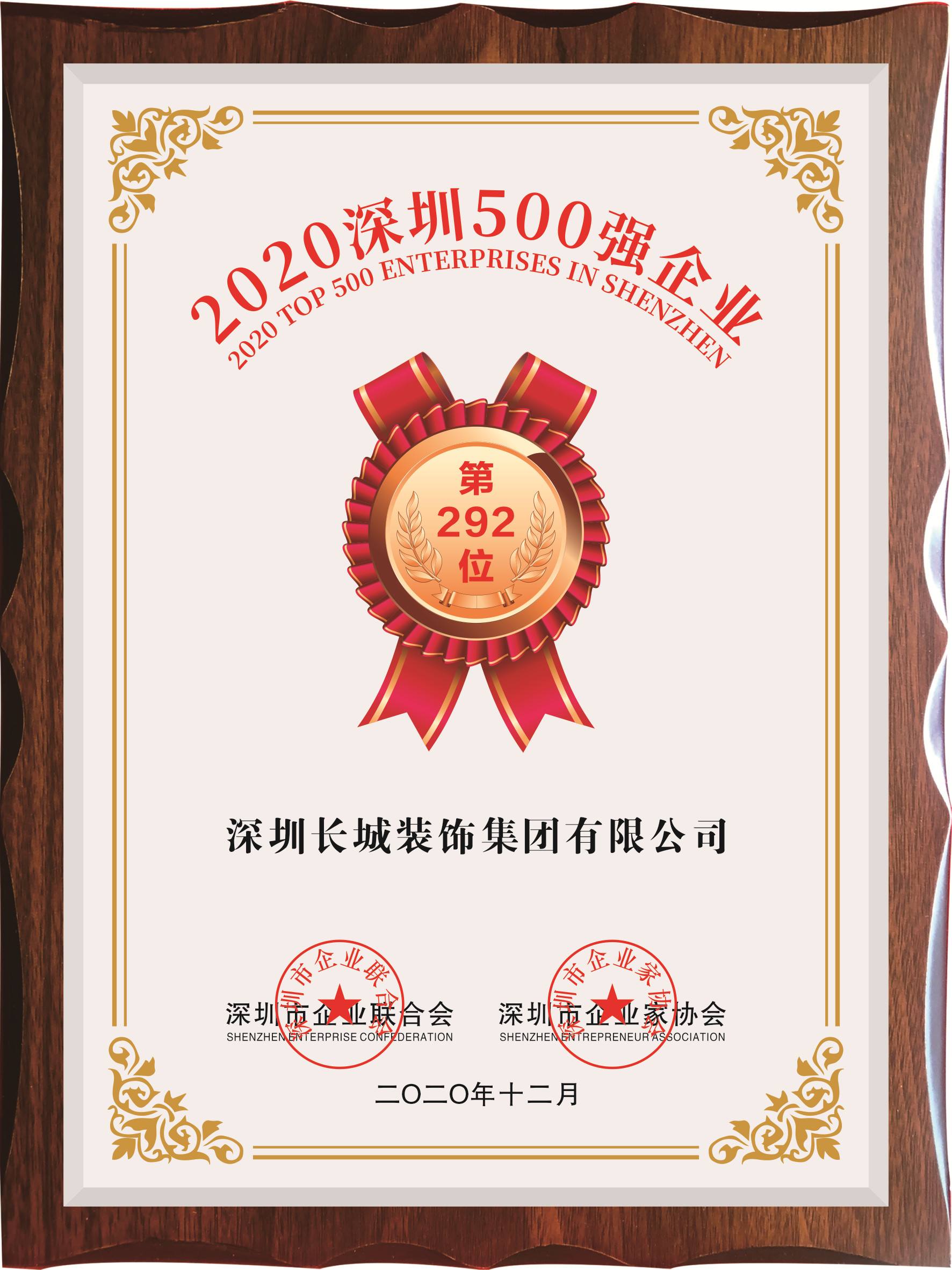 2021-1-29由深圳市企业联合会、深圳市企业家协会联合发布的“2020深圳500强企业榜单” 和《2020深圳500强企业发展报告》受到社会各界的广泛关注。长城装饰集团以企业综合实力位列榜单292名。