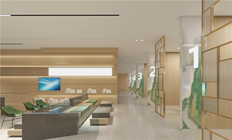 项目方案以“山水丹青杂,烟云紫翠浮”为故事线,通过光透过绿叶素与泥土融合长出树木,树木吸收光释放生命,微妙平衡,生态持续中提取的“生机,静谧,融入柔和的曲面,形成静谧自然的环境”作为设计元素。采用橡胶板地面、天然石材墙面、云海抽象图案艺术玻璃背景墙、浅色木饰面、不锈钢等为主要材料,突出清新、典雅、朴素的行业特点,同时色彩设计符合卫生学的要求。装修材料的性能既达到规定的环保指标,同时也符合简洁、耐用、安全的功能,也具备一定的艺术性和美观设计感。