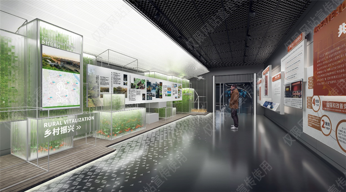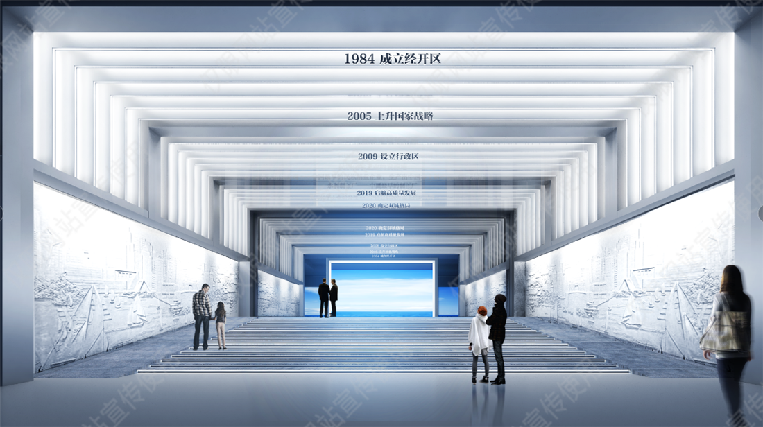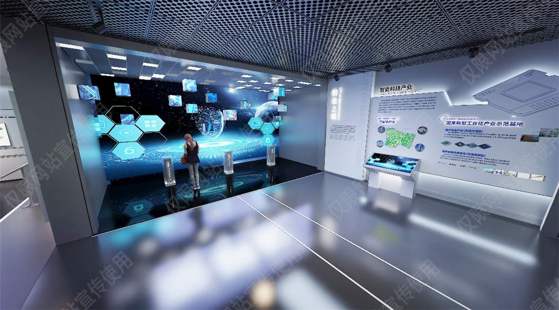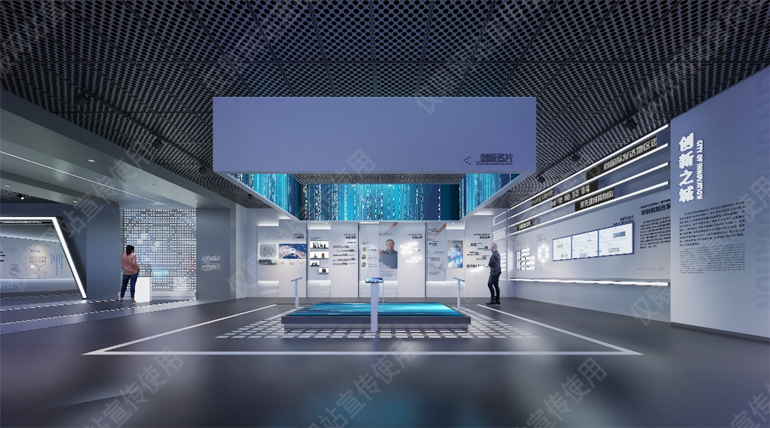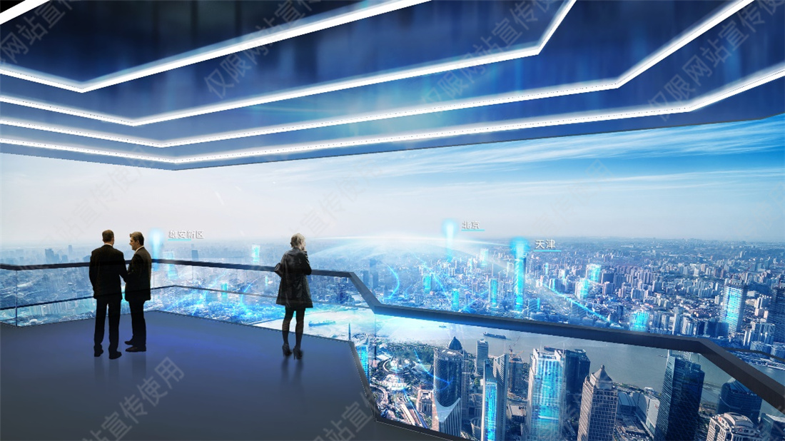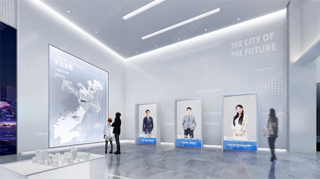 在方案设计上采用了现代白、质感灰以及科技蓝为主色调,通过超高清大屏交互序片、全息沙盘-沉浸式梯形四折幕BOX、长卷大屏、L型瀑布屏、智能电子滑动屏、版画、天地联动幕、机械矩阵与手掌感应、半景画、3Dmapping投影互动等高科技手段应用在各个主题展区,全方位体现滨海新区“一基地三区”定位,“津城”“滨城”双城发展布局,“一主两副双港多组团”,“一屏、一带、五廊道”生态空间格局。以及发展质量效益、现代产业体系、国家战略实施等内容。