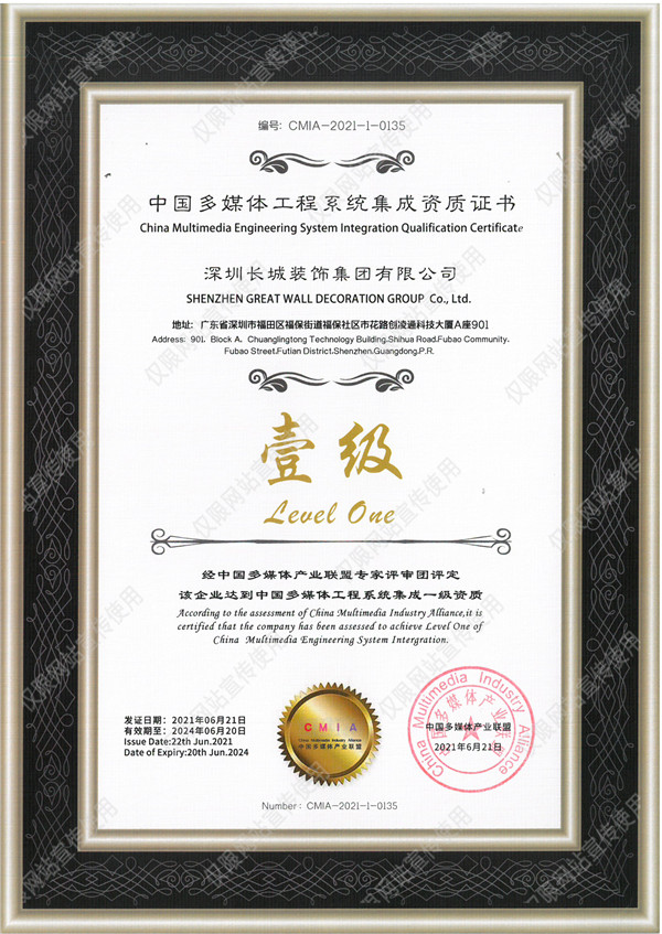 经由中国多媒体产业联盟(China Multimedia Industry Alliance,简称CMIA)专家评审团评定审核,长城装饰集团获得“中国多媒体工程系统集成一级资质”。为集团承包事业全面发展再添基石。