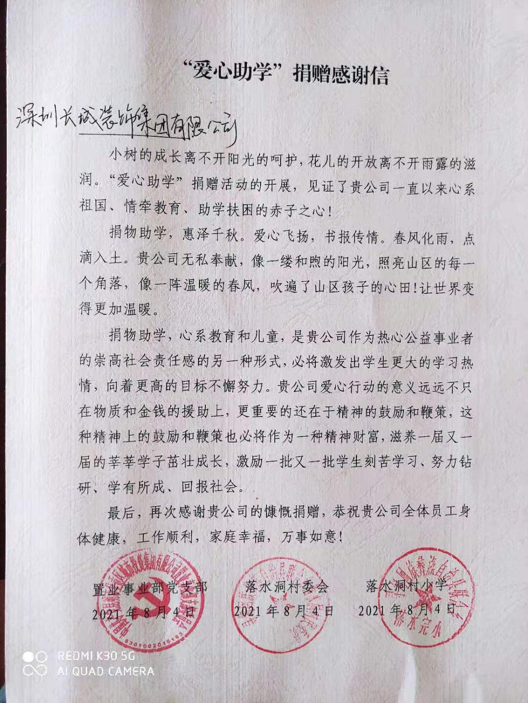 2021年8月4日,在云南寻甸回族彝族自治县联合乡落水洞村小学举行的“爱心助学”捐赠仪式中,深圳长城装饰集团有限公司代表向该校完成了捐赠物资交接。