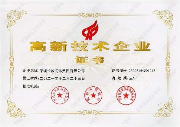 2022-2-17近日,深圳长城装饰集团获得深圳市科技创新委员会、深圳市财政委员会、深圳市国家税务局及深圳市地方税务局联合颁发的“高新技术企业”认定,认定时间为2021年,有效期为3年。这是公司自2017年首次通过 “高新技术企业”认定以来,第二次被认定为“高新技术企业”。