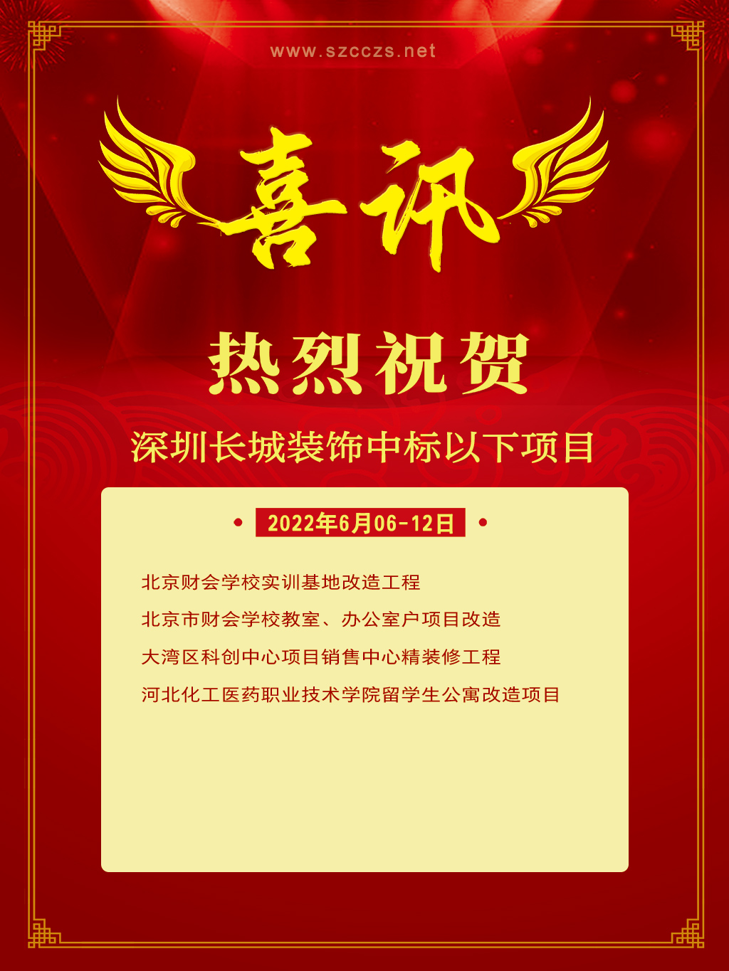 中标喜讯 | 6月06~12日长城装饰集团工程中标项目