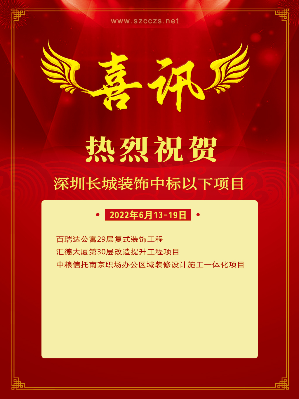 中标喜讯 | 6月13~19日长城装饰集团工程中标项目
