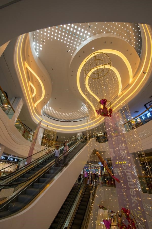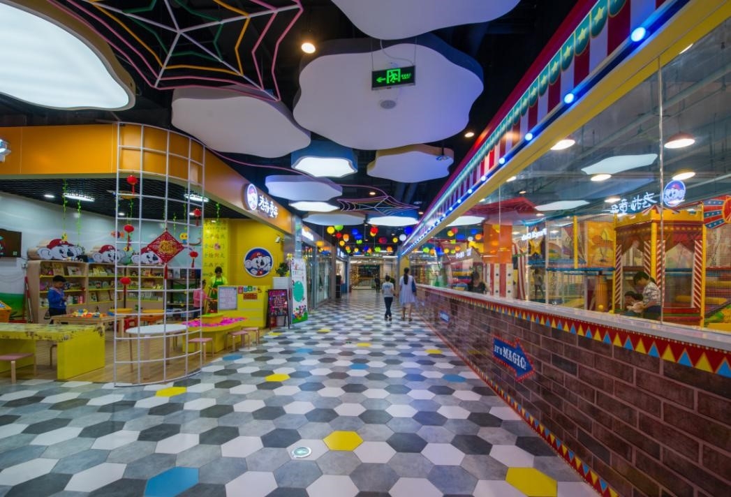 获奖项目“星河城市广场负二层至四层商业部分装修及安装工程”位于广东省东莞市,充分利用建筑的空间结构,延长商品展示与品牌形象展示的线与面,空间疏、密、高、低及其展示层要符合人体工学的视觉效果,利用不同材质和造型的天花结构具有流线型,具富美感。中庭柱身钢结构构造新颖,极富艺术欣赏性。柱身、墙身铝板与透光板圆点排列弧线增加流动感。地面地砖套割精确,接缝严密,整体美观。新型材料GRC波浪板应用,材质轻,安全性能好,丰富了天花造型。铝质转印木面天花弧形线条造型排列均匀,具有韵律感。铝质转印木面板安装平整度好,拼缝严密,结构安全。地面采用不同颜色的六角地砖,与天花造型相互响应,营造出童话般的儿童世界。