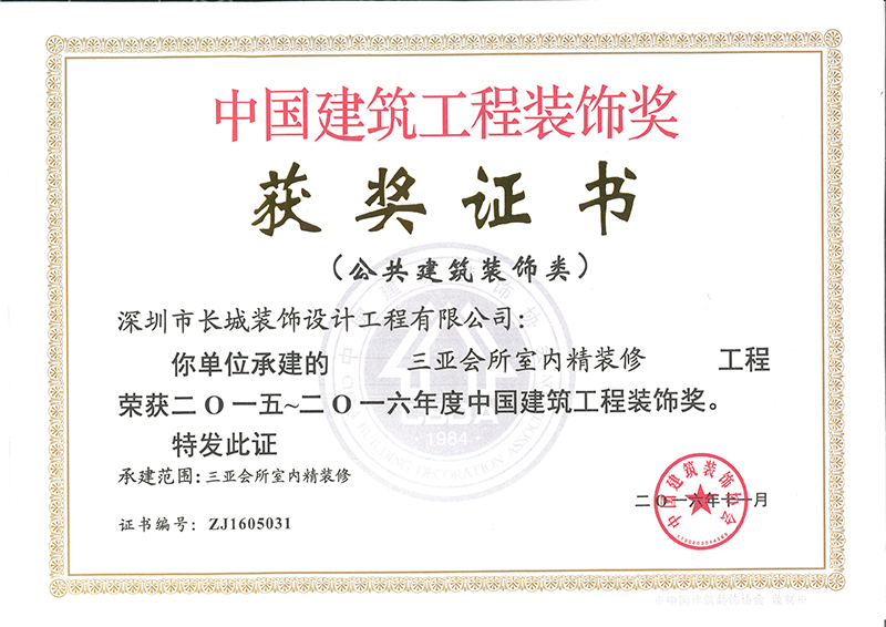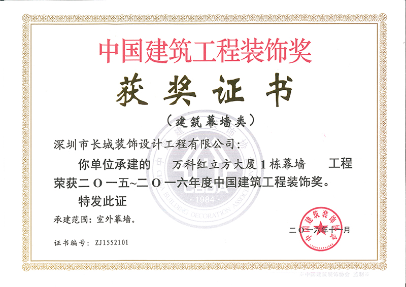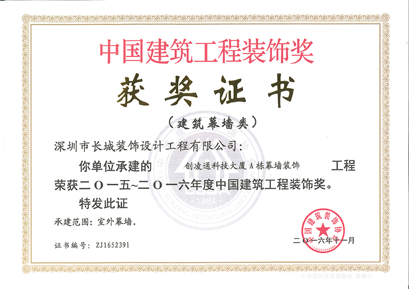 热烈祝贺我司“创凌通科技大厦幕墙工程”、“海南三亚会所精装修工程”、万科红立方大厦1栋幕墙工程“三项工程荣获2016年“中国优秀建筑工程装饰奖”称号